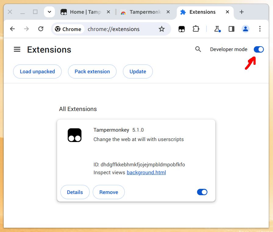 - 如果您使用的是未由官方商店签名的 Tampermonkey 版本,您需要在浏览器扩展页面的右上角启用“开发者模式”开关。然后,按照 Q407 中的说明将下载的 CRX 文件拖放到扩展页面上。