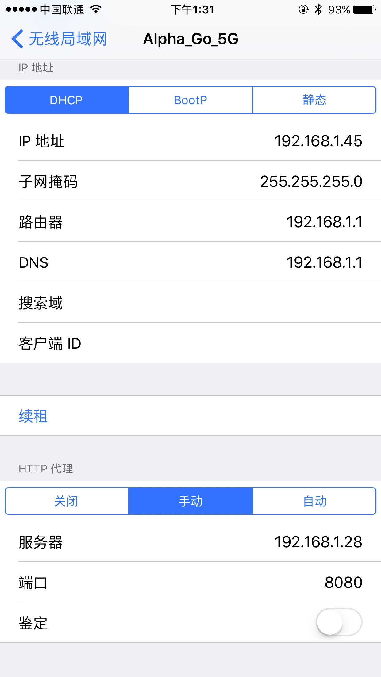 一般类似 10.*.*.* 或 172.16.*.* 或 192.168.1.* 这样的 IP 就是当前 PC 的局域网 IP,例如此图中 PC 的 IP 为 192.168.1.28,手机代理设置类似如图 11-15 所示。