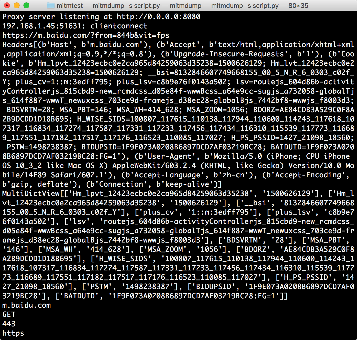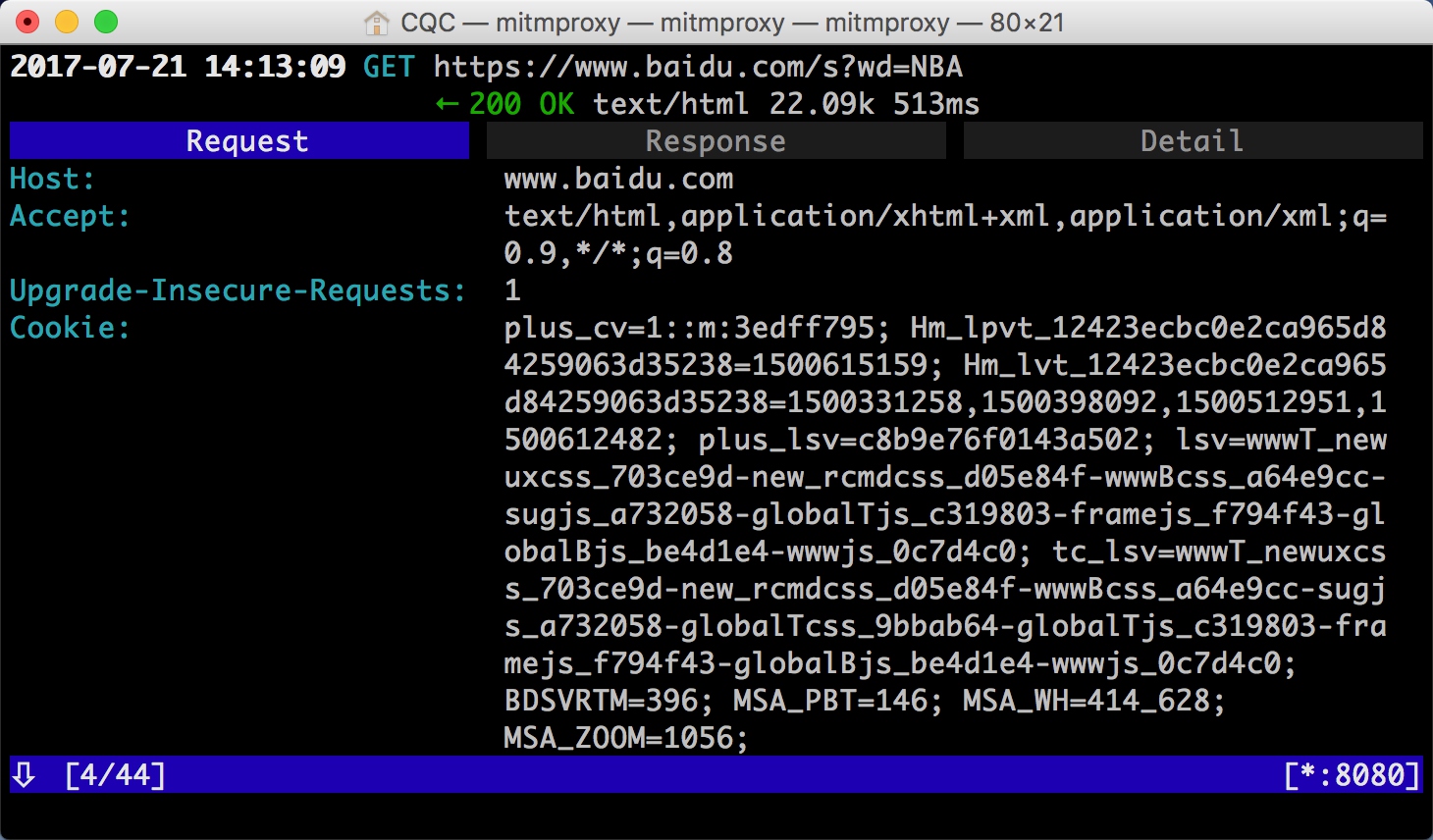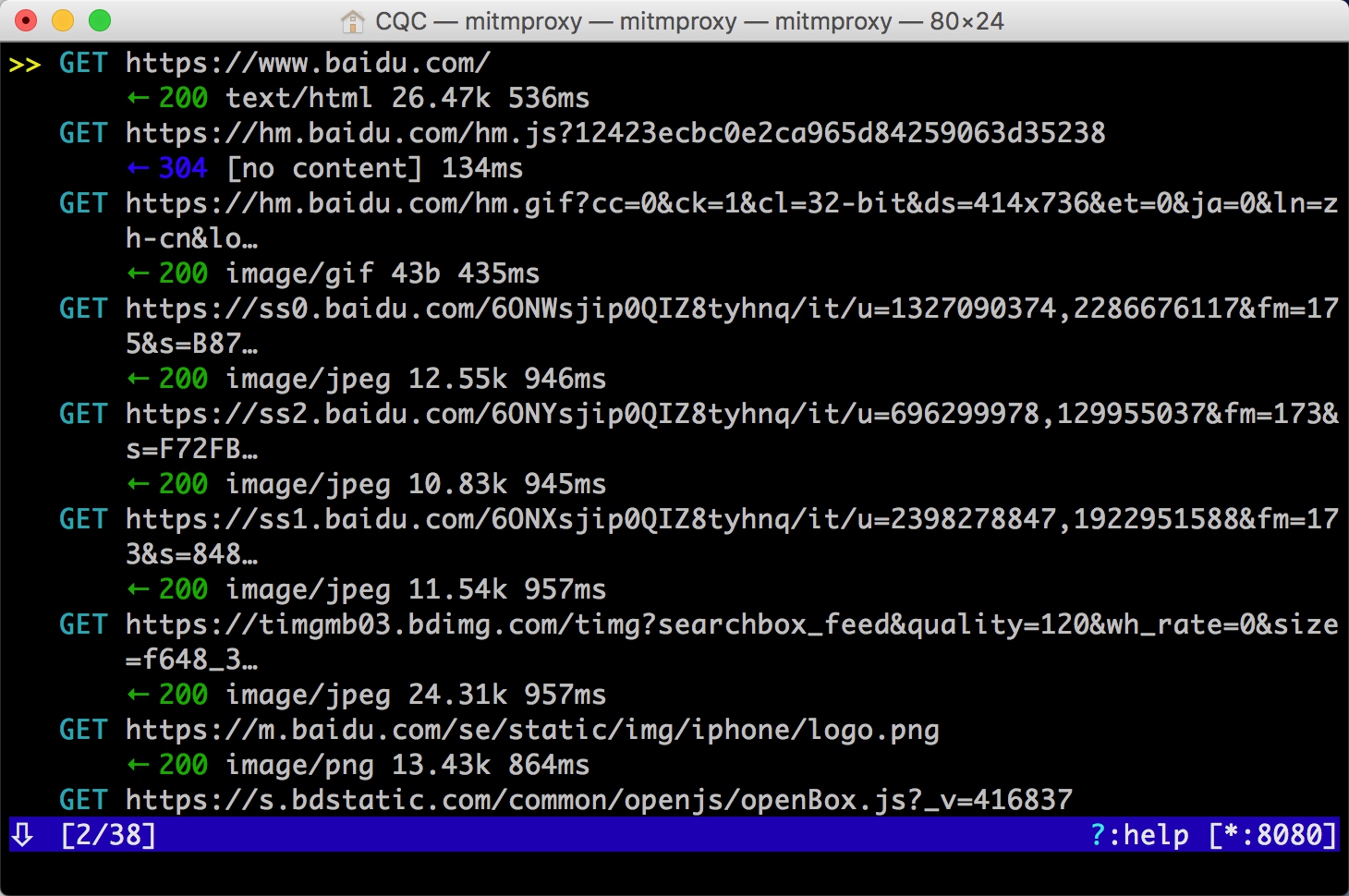 这就相当于之前我们在浏览器开发者工具监听到的浏览器请求,在这里我们借助于 mitmproxy 完成。Charles 完全也可以做到。
