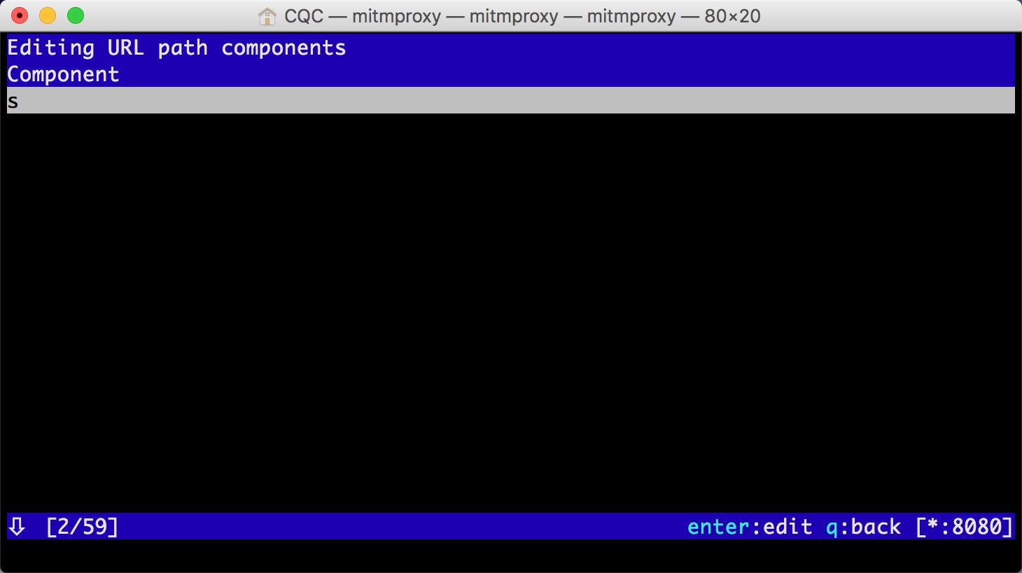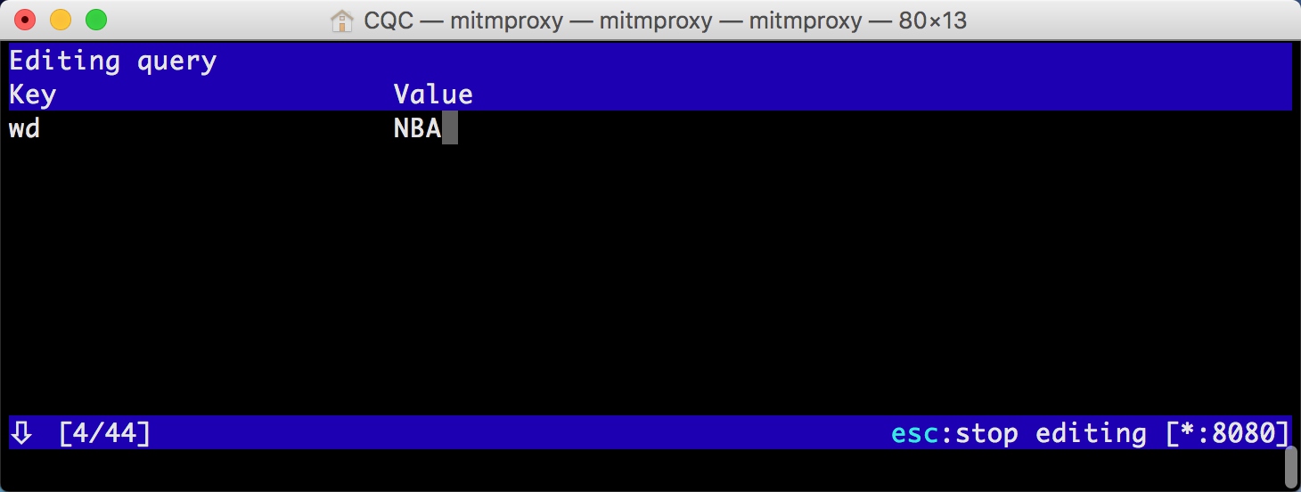 mitmproxy 还提供了命令行式的编辑功能,我们可以在此页面中重新编辑请求。敲击 e 键即可进入编辑功能,这时它会询问你要编辑哪部分内容,如 Cookies、Query、URL 等,每个选项的第一个字母会高亮显示。敲击要编辑内容名称的首字母即可进入该内容的编辑页面,如敲击 m 即可编辑请求的方式,敲击 q 即可修改 GET 请求参数 Query。