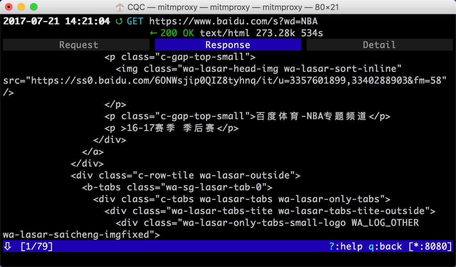 最上方是一个 Request、Response、Detail 的列表,当前处在 Request 这个选项上。这时我们再点击 TAB 键,即可查看这个请求对应的响应详情,如图 11-18 所示。