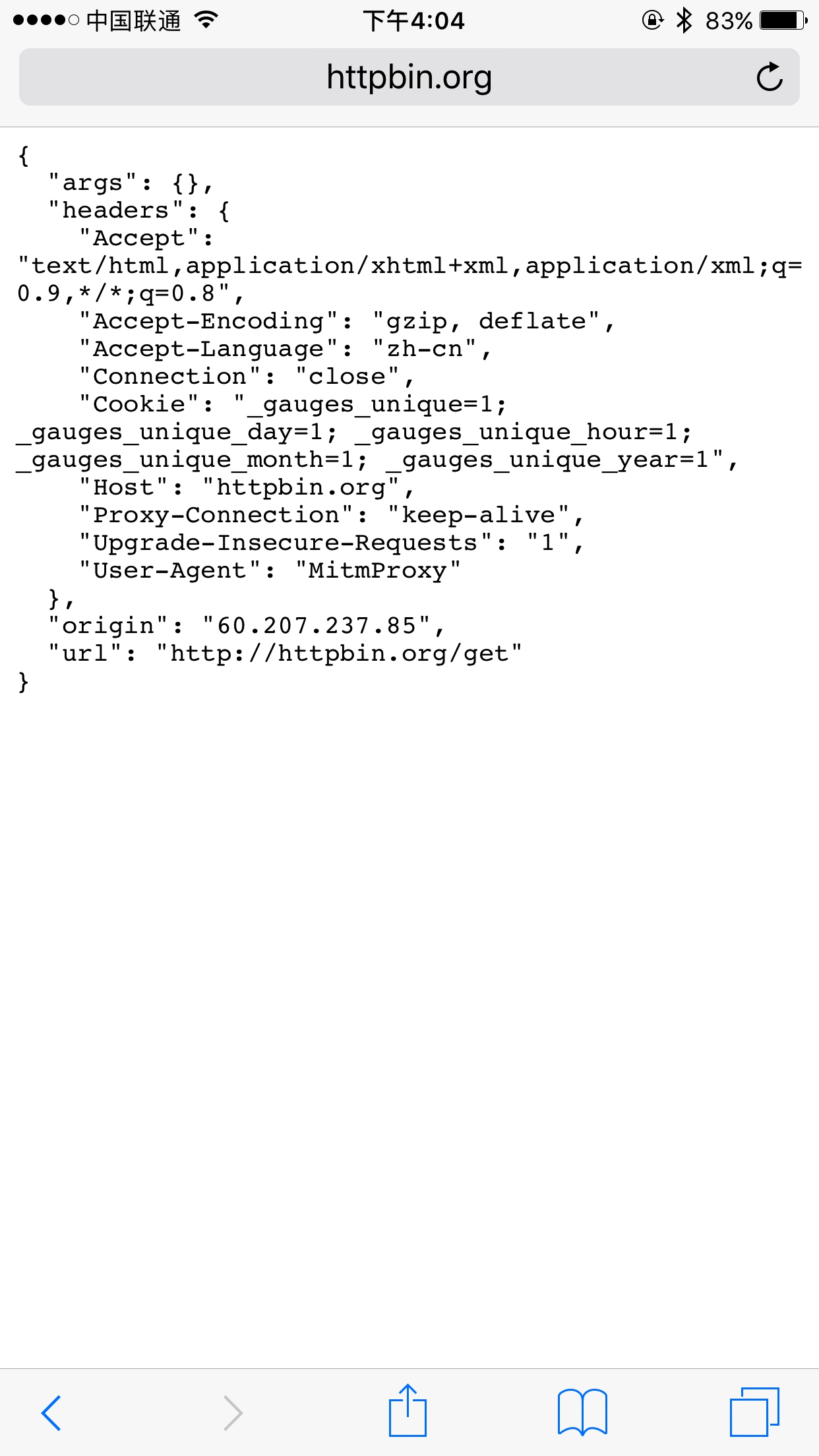 运行之后我们在手机端访问 http://httpbin.org/get,就可以看到有如下情况发生。