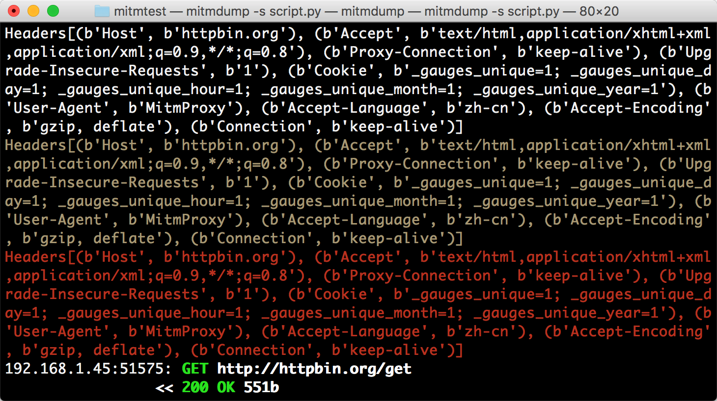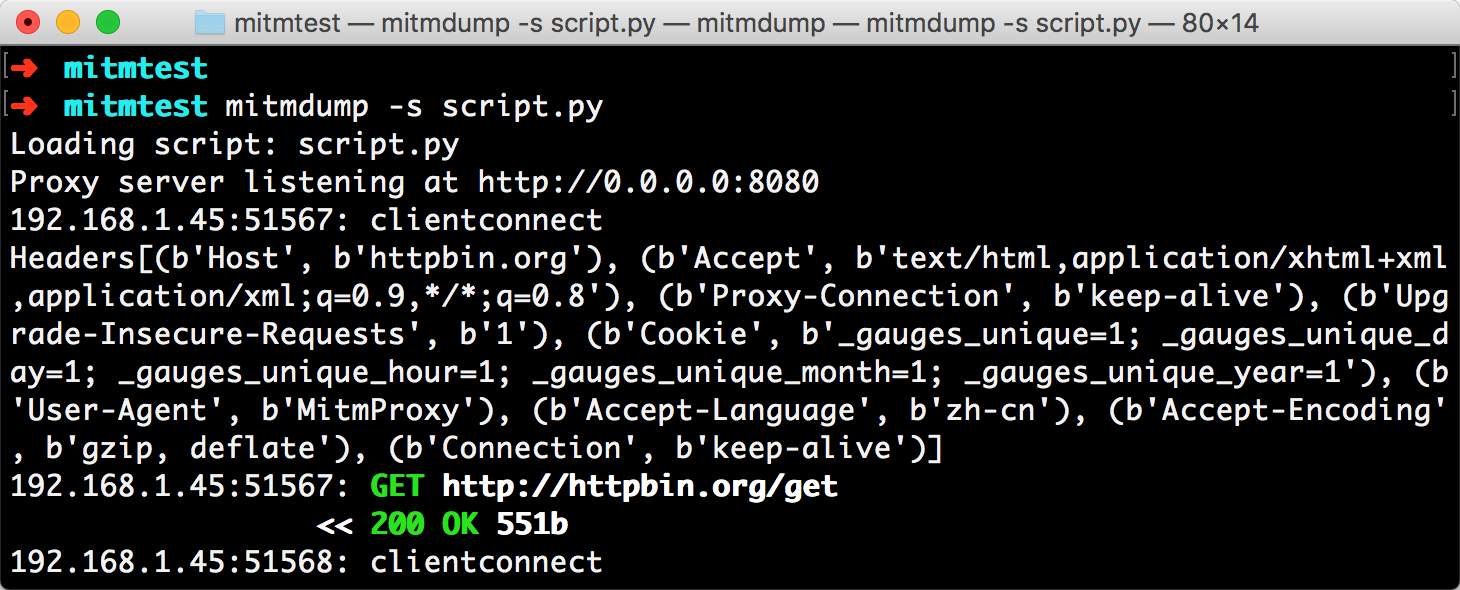 print(flow.request.headers)我们定义了一个 request() 方法,参数为 flow,它其实是一个 HTTPFlow 对象,通过 request 属性即可获取到当前请求对象。然后打印输出了请求的请求头,将请求头的 User-Agent 修改成了 MitmProxy。