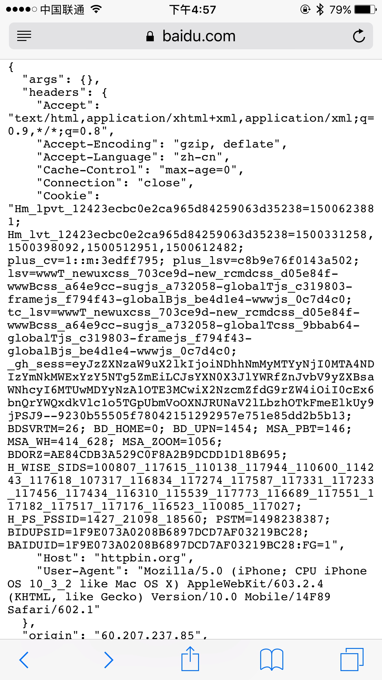 比较有意思的是,浏览器最上方还是呈现百度的 URL,但是页面已经变成了 httpbin.org 的页面了。另外,Cookies 明显还是百度的 Cookies。我们只是用简单的脚本就成功把请求修改为其他的站点。通过这种方式修改和伪造请求就变得轻而易举。